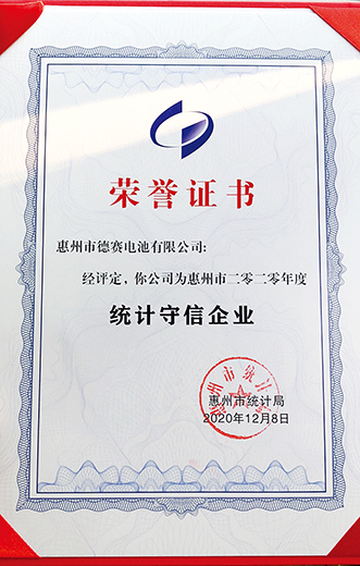 麻将胡了2电池获评2020年度惠州市“统计守信企业”